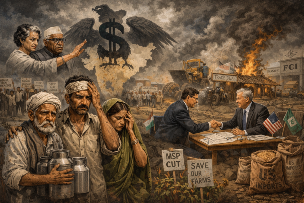 लक्षात घ्या, तेव्हापासूनच आणि त्याही अगोदर, अमेरिकन लोकांची भारतीय बाजारपेठेवर गिधाडाची नजर होतीच! अमेरिकन शेतमालाची भारताला निर्यात सहजसुलभ व्हावी म्हणून, थेट भारताचं MSP धोरण आणि FCIच्या गोडाऊन्सच्या संरचनेवर देखील ते प्रभाव टाकू इच्छित होते. काँग्रेसच्या लाल बहादूर शास्त्रींनी “जय जवान, जय किसान’ घोषणा देत केलेलं शेतकऱ्यांच्या हित-रक्षण महत्कार्याचं…या भाजप-संघीय लोकांनी, मूठभर भांडवलदारांच्या हितासाठी आणि ‘अमेरिकन फासा’तून आपली मान सोडवून घेण्यासाठी अक्षरशः वाटोळं करायला घेतलंय. “सब का साथ, सब का विकास”, असं दामटून खोटं ‘नॅरेटिव्ह सेट’ करुन २०१४ची लोकसभा-निवडणूक, या लोकांनी जिंकली खरी; पण, निवडणुकीत दिलं गेलेलं, “एकूण शेतकी निविष्ठांसह उत्पादन-खर्चावर ५०% नफाधारित ‘किमान आधारभूत किंमती’चं (MSP…Minimum Support Price) आश्वासन”, हे “प्रत्येकाच्या खात्यात १५ लाख जमा होण्यासारखंच एक ‘जुमला’ ठरलं”!